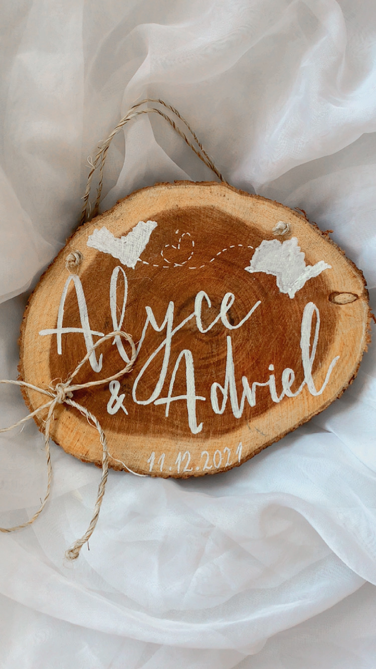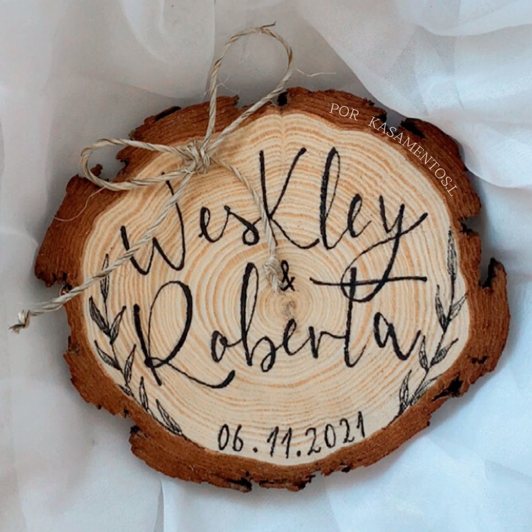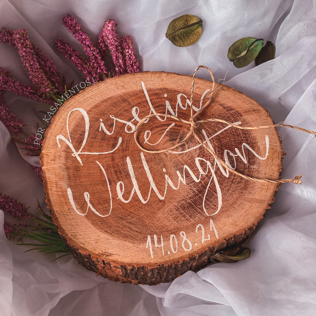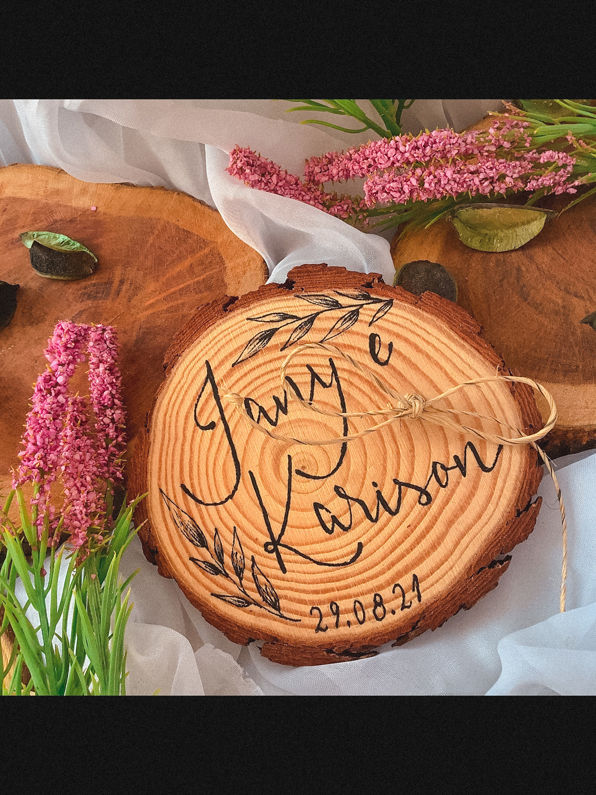 Rústicos em madeira natural, com personalização fixa e feita à mão. Ele não só se pode usar como porta aliança, mas como também em sessão de foto antes do casamento e no casamento também ( te dou ideia de fotos ), usados também na decoração compondo alguma mesa de doces, bolo, recados, mesa dos noivos... e posteriormente na casa do casal, uma ideia legal é perfurar e pendurar na porta do quarto por exemplo. O valor varia de 45,00 à 58,00. Disponíveis em dois tamanhos